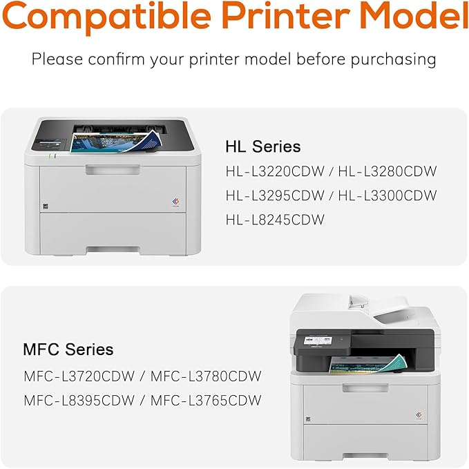 - Compatibility Options : Brother HL-L3220CDW, HL-L3280CDW, HL-L3300CDW, HL-L3295CDW, HL-L8245CDW, MFC-L3780CDW, MFC-L3720CDW, MFC-L3765CDW, MFC-L8395CDW Brother HL-L3220CDW, HL-L3280CDW, HL-L3300CDW, HL-L3295CDW, HL-L8245CDW, MFC-L3780CDW, MFC-L3720CDW, MFC-L3765CDW, MFC-L8395CDW