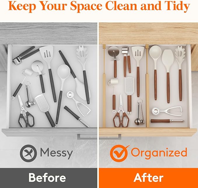 - Refined Material: Our kitchen drawer divider is made from high-quality, medium-tension springs that won’t damage your drawers, while scratch-resistant pads at the ends protect your drawers from marks or residue, ensuring a long-lasting and pristine finish