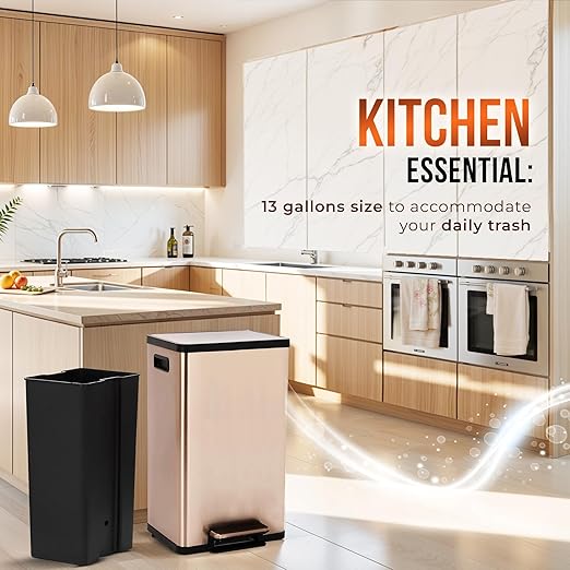 - 13 Gallon Step Trash Can: Ideal for kitchen use, this can fits most brands of trash bags