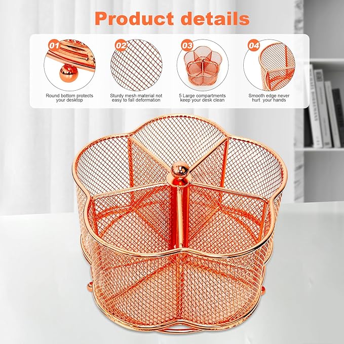 360 Degree Rotate Pen Holder for Desk Mesh Desk Pen Organizer Pencil Holder Large Capacity Accessories & Workspace Organizers for School,Home (Rose Gold, No hook)