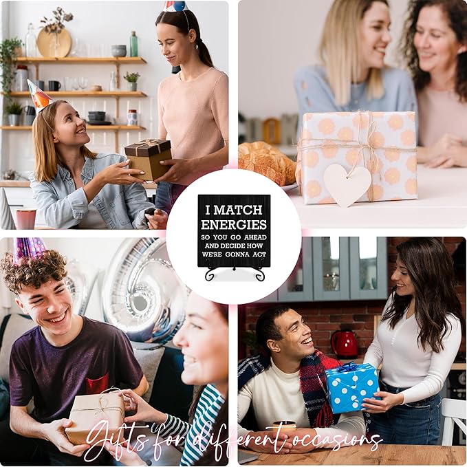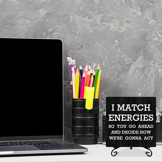Office Positive Wooden Sign Gift With Metal Stand - I Match Energy - Inspirational Wood Plaque, Gift For Women & Men, Home & Office Desk Decor & Accessories(5 X 5 Inches) - A11