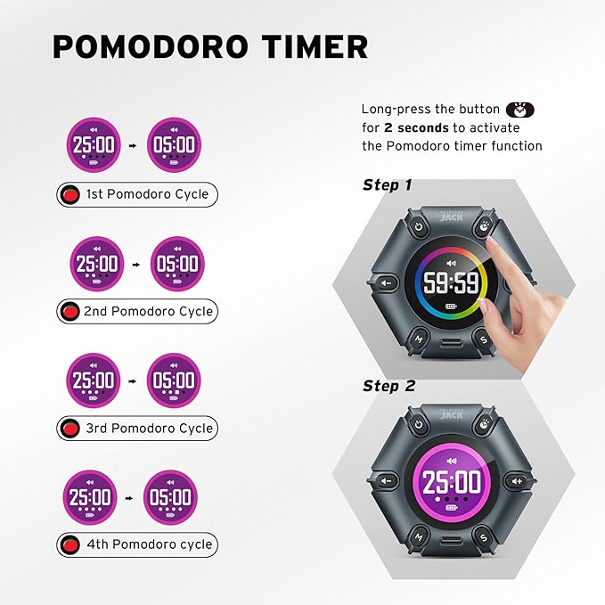 - Pomodoro Timer: This timer includes built-in Pomodoro timing. Simply press the tomato button to start the Pomodoro method: 25 minutes of focused work followed by a 5-minute break, repeating this cycle four times. This helps you use your time more efficiently. It is versatile and suitable for various activities, including work, meetings, studying, reading, exercising, cooking, and more. You can use this timer in virtually any situation!