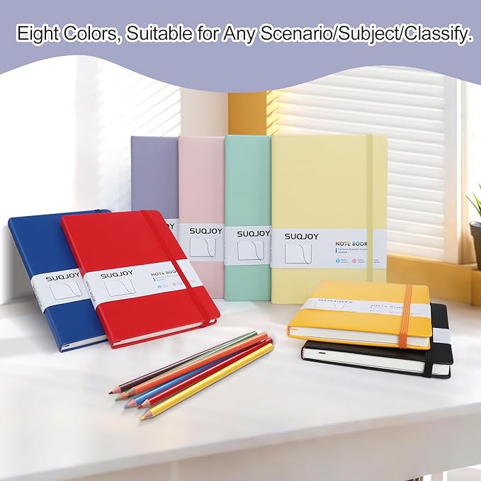 - Hardcover Leather Journal: SUQJOY medium 5.5×8.3 inches A5 lined journal, is made of waterproof faux leather, providing enhanced protection for the inner pages. 160 college ruled lined pages, with an expandable inner pocket, a ribbon bookmark, and an elastic closure band.
