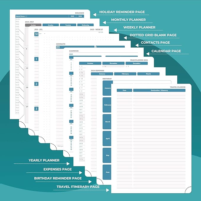 - Monthly Planner: Covers July.2025-Dec.2026. It adopts a double-page design for one week, so you can get a general overview without turning pages. The weekly planner page provides writing space for arrangement of daily tasks, priority management and activity records; the left side of the monthly plan marks important dates, and the right side plans special tasks