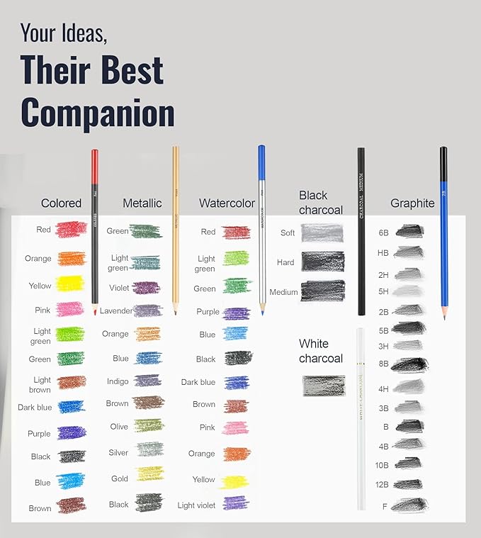 - COMPLETE & PROFESSIONAL SKETCHING KIT: This all-in-one 106-piece sketching kit provides everything you need for sketching, drawing, and coloring. The sketching supplies include 12 oil-based colored pencils, 15 graphite pencils, 12 watercolor pencils, 7 black charcoal pencils, 12 metallic colored pencils, 3 white charcoal pencils, 2 colored charcoal pencils, 1 marker, designed for artists of all skill levels and ages