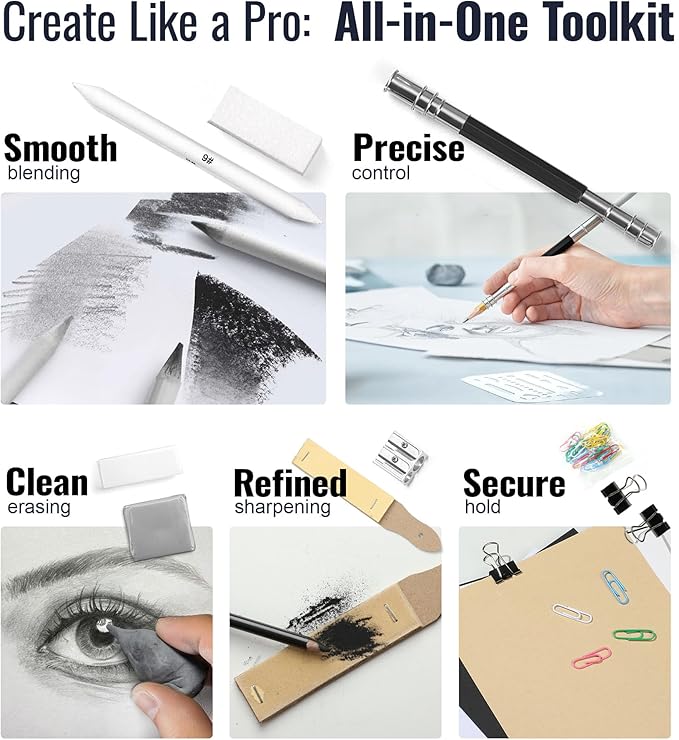 - EXTRA DRAWING & SKETCHING SUPPLIES: Our sketching supplies are packed with essential tools to refine your artwork and explore new styles. The art supplies include 3 blending stumps, 1 paintbrush, 1 dual-hole sharpener, 1 pencil extender, 1 sandpaper block, 1 refillable water brush pen, 1 white eraser, 1 vinyl eraser, 25 paper clips, 2 binder clips, 1 sponge and 1 travel case