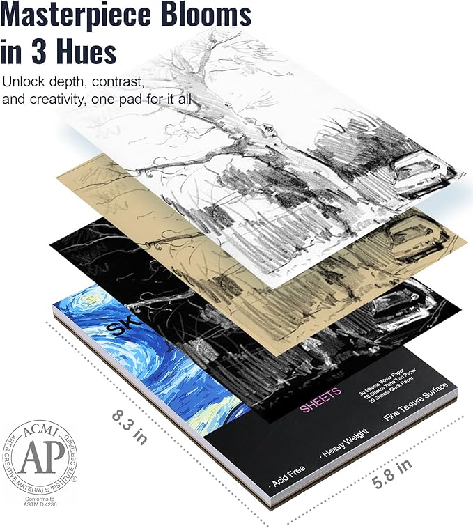 - UNIQUE 3-COLOR SKETCH PAD & COLORING BOOK: Unlock new artistic possibilities with a sketchpad featuring 50-page sections in 3 distinct colors. The varied paper tones provide the ideal canvas for dynamic shading, highlights, and contrasting effects, allowing you to experiment with different styles using sketching supplies. Complementing this is a 32-page coloring book filled with intricate designs, providing a relaxing coloring experience