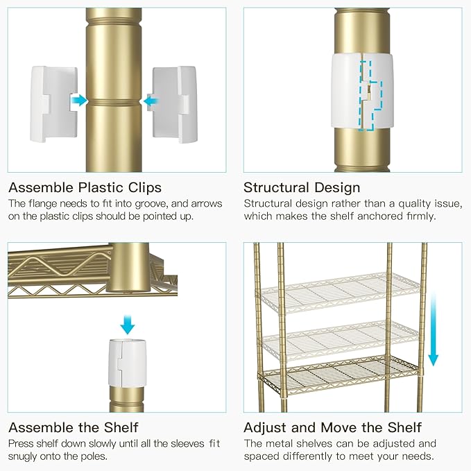 - [Easy to Assemble]: A rubber hammer (NOT INCLUDED) is recommended to gently hit the shelves to make them more compact. Easy assembly, no other tools needed
