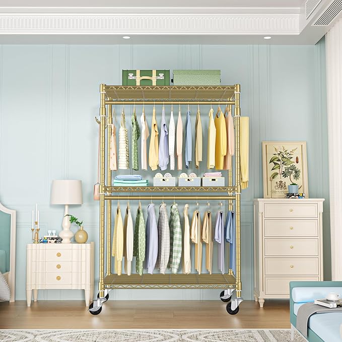 P1 Rolling Clothes Rack, Movable Metal Garment Closet Organizer with Lockable Wheels, Clothing Wardrobe with Double Hanger Rods and Hooks, 35.4" W x 15.7" D x 80.5" H, Load 450lbs, Gold