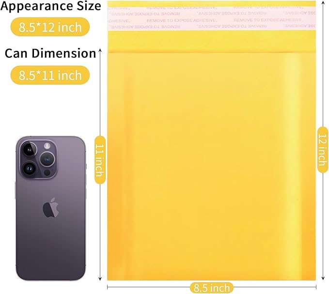 - 8.5×12 Bubble Mailers size:Our Kraft bubble mailers appearance Size 8.5x 12" inch,usable dimension 8.5x 11" inch,With 50 yellow self seal adhesives padded envelopes.The light weight can reduce transportation costs and can be used to package and transport trading card,office supplies,jewelry,cosmetic and more,great for small business packing.