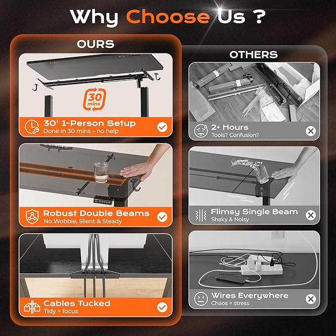 - 【Built to Last with Exceptional Stability】The industrial-grade steel frame and T-shaped design of the stand up desk support up to 220 lbs, ensuring stability and reliability for years to come. Paired with a durable motor, this home office desk is designed to meet the demands of your dynamic workday