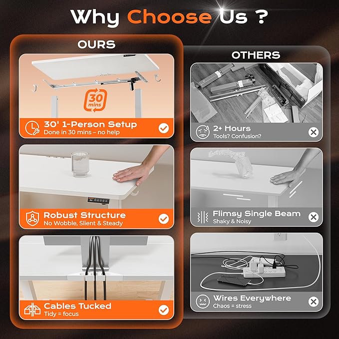 - 【Built to Last with Exceptional Stability】The industrial-grade steel frame and T-shaped design of the stand up desk support up to 220 lbs, ensuring stability and reliability for years to come. Paired with a durable motor, this home office desk is designed to meet the demands of your dynamic workday