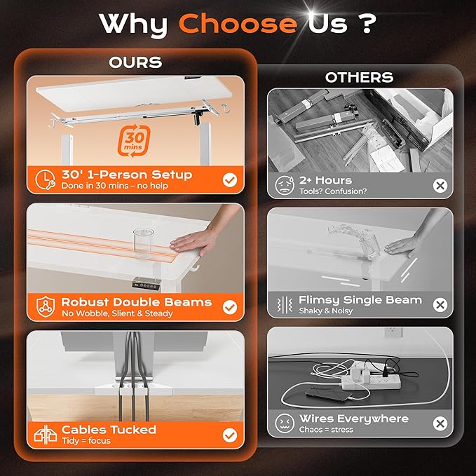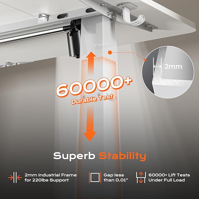 - 【Built to Last with Exceptional Stability】The industrial-grade steel frame and T-shaped design of the stand up desk support up to 220 lbs, ensuring stability and reliability for years to come. Paired with a durable motor, this home office desk is designed to meet the demands of your dynamic workday