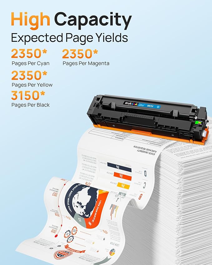 - High Page Yield: 3,150 pages per 067H black toner cartridge and 2,350 pages per 067H color C/M/Y toner cartridge (at 5% coverage of A4/letter paper)