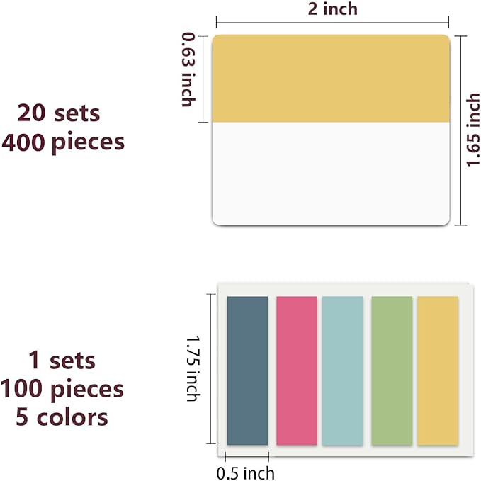 - 500 pieces Tabs: 500 pieces 21 sets in total, 400 pieces 2 inch sticky tabs in 20 sets with different pastle colors,100 pieces 0.5 in tabs in 1sets, 20 pieces each color
