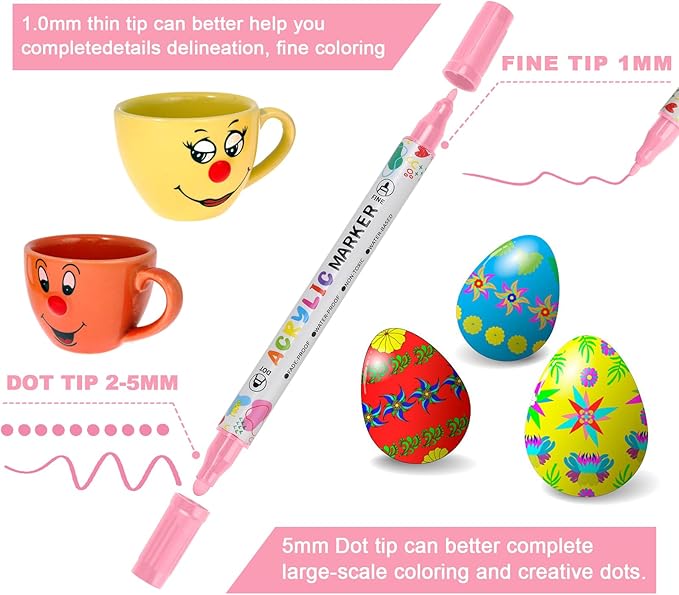 - Multi purpose Dual Tip Acrylic Paint Pens with Fine and Dot Tips ---- Each KEMYR pen is equipped with a 1-5 mm dot tip for filling large areas and bold points, and a 1 mm fine tip for lines and details work.
