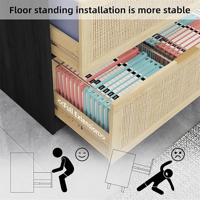 - 【Structure Lateral File Cabinet& Safe and Durable 】There is a black reinforced metal rod in the middle of the drawers of the filing cabinet, which can effectively avoid the problems of metal falling off on both sides and drawer deformation that often occur in other filing cabinets. Made of high-quality engineered wood, with a floor standing design and equipped with anti rollover devices, it has stronger stability and load-bearing capacity. Circular metal handle protects your hands from scratches