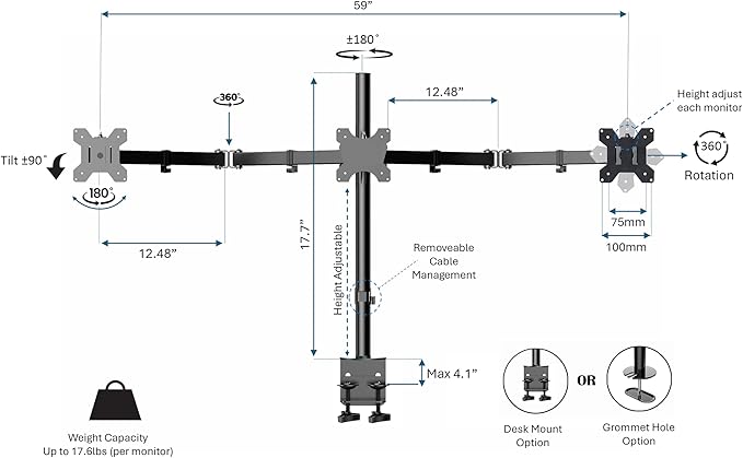 - Standing Desk Converter Bundle includes 45" Desk Riser (R ADRB-45) and Triple Monitor Arm (R DM3) for easy ergonomic positioning and optimal viewing comfort for 13"-27" flat panel monitors. Mount installs directly into convenient desktop grommet hole.