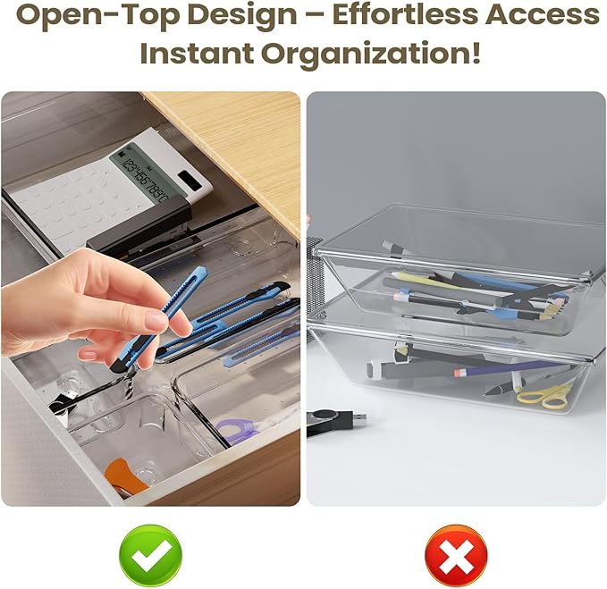 - Non-Slip Interior & Textured Surface:The interior base features a raised square grid pattern that enhances friction, effectively preventing small items such as jewelry, cosmetics, or office supplies from sliding during drawer movement. A complimentary non-slip silicone pad is included to attach to the bottom of the organizer, ensuring the product remains securely in place while opening/closing drawers.