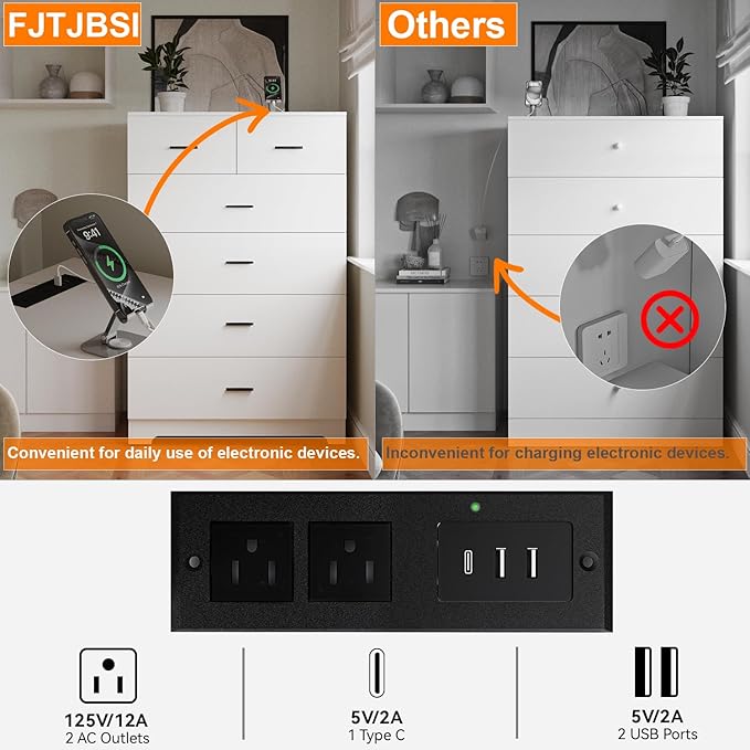 - ✔️【Multi-functional Upgrades】FJTJBSI wooden dresser with charging station has 2 AC outlets &2 USB ports & 1 Type C ports Easily charge your electronic devices without the need for extra cables.
