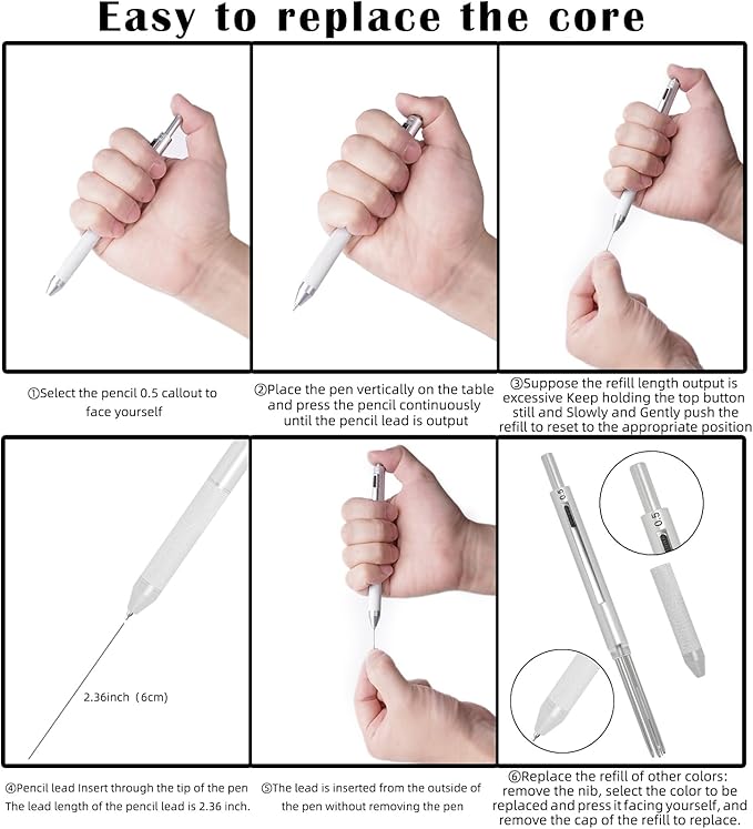 - 3 colors of black, red, blue and 1 mechanical pencil(0.5mm), multicolor pen in one premium -mechanical pencils and pen combo -the best cool multicolor pens. To match the refill, search for ASIN: B0CTQMR99T (Black); B0CTQLVLPJ (Blue); B0CTQMLNMG (Red).