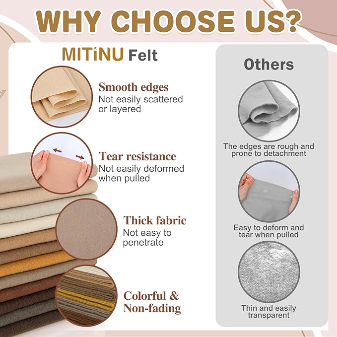 - 【High Quality】:Crafted from high-quality raw materials, this felt boasts a dense texture, exceptional durability, and resistance to deformation. Its smooth surface, fray-resistant edges, and plush softness ensure effortless cutting and sewing, while every detail reflects our rigorous commitment to quality.