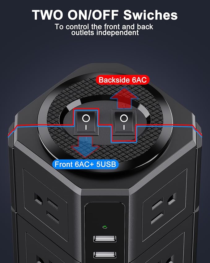 - SEPARATED DUAL SWITCHES: The top of the surge protector power strip tower has two independent switches that control the power strip surge protector tower on/off of both sections, making it easy to turn off multiple unused electronic devices without having to plug and unplug the switches, making it easier for you to manage all your connected devices and reduce power supply waste.