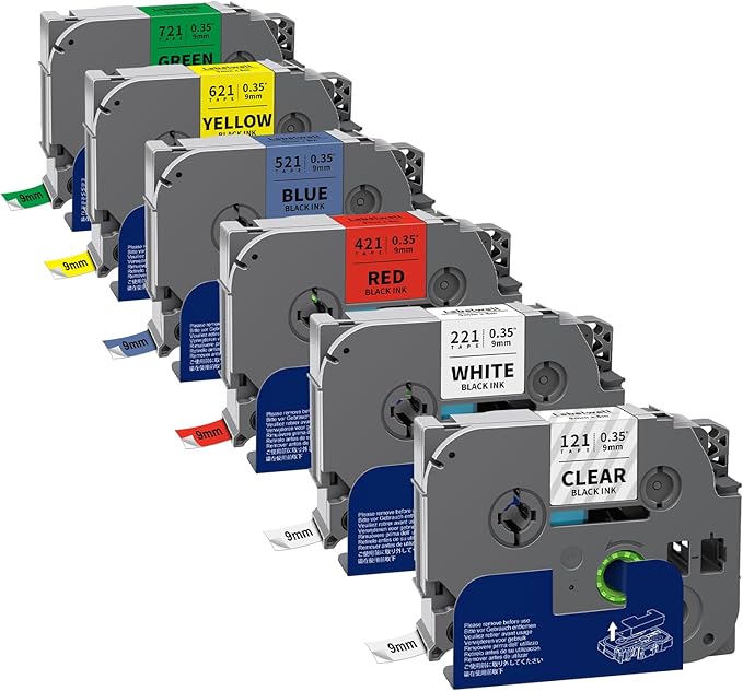 - Package Contents: 6-Pack Replacement for P Touch Label Tape TZe-121 (Black on Clear), TZe-221 (Black on White), TZe-421 (Black on Red), TZe-521 (Black on Blue), TZe-621 (Black on Yellow), TZe-721 (Black on Green), total 6-packs