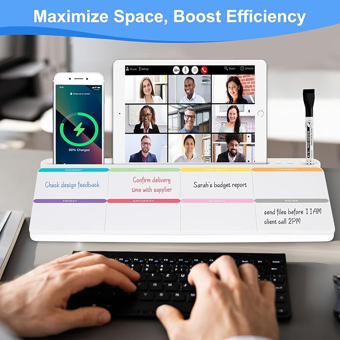 - Weekly Planner Whiteboard - Stay on top of your weekly schedule with ease using our desktop whiteboard. It features a colorful weekly grid with clearly defined sections for each day and notes. Crafted from tempered glass, it offers a smooth writing experience and effortless clean-up—no stains, no scratches. Perfect for organizing tasks, writing to-do lists, and taking quick reminders.