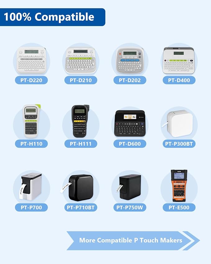 - Compatible with Brother Ptouch Label Maker: PT-D210, PT-D220, PT-H110, PT-D200, PT-H111, PT-D610BT, PT-D460BT, PT-D410, PT-D600, PT-P710BT, PT-P310BT, PT-1290, PT-H100, PT-D400AD, PT-P700, PT-1230PC, PT-1890C, PT-D600VP, PT-P750W, PT-2730VP, PT-D450, PT-D400, PT-1880C, PT-1880, PT-H500LI, PT-2730, PT-1890w, PT-2430PC, PT-9700PC, PT-2300, PT-1280SR, PT-2030AD, PT-1090, PT-1880w, PT-9600, PT-1000, PT-1010 ect