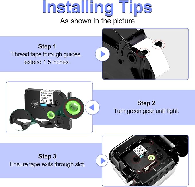 - Package Included: 2 pack KCMYTONER compatible for ptouch TZe-221 TZ-221 AZe-221 laminated label maker tape. Color: black print on white; width: 9mm (3/8" or 0.35 inch), length: 8m (26.2ft) each.