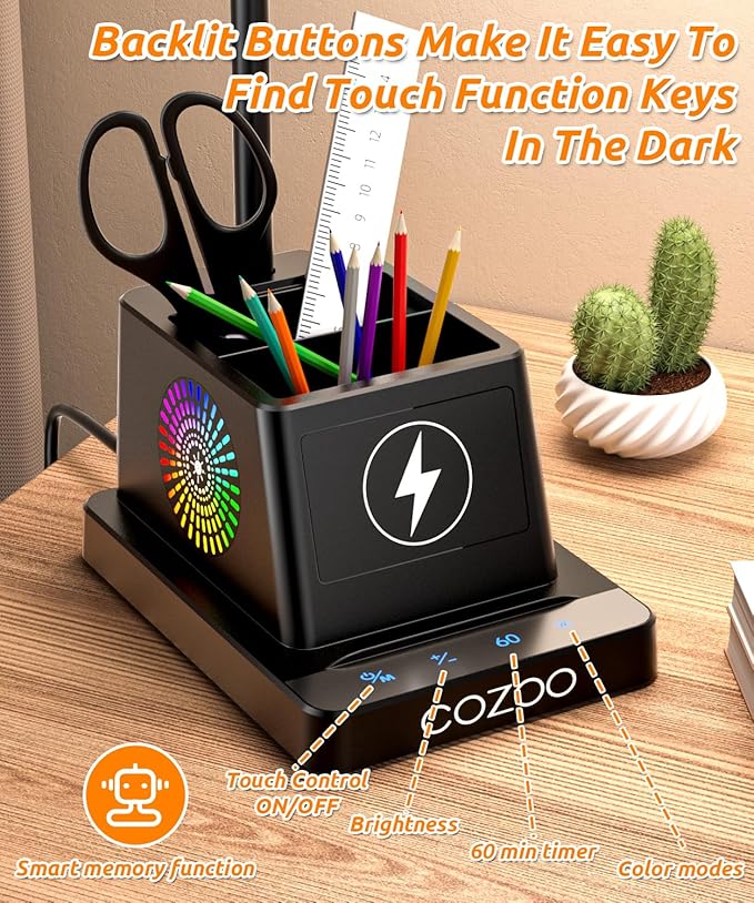Desk Lamp with Wireless Charger, COZOO LED Desk Lamps for Home Office, Eye-Caring LED Light with Pen Holder for College Dorm Room, Gooseneck Table Lamp for Bedside Office Bedroom Study,Dorm Essentials