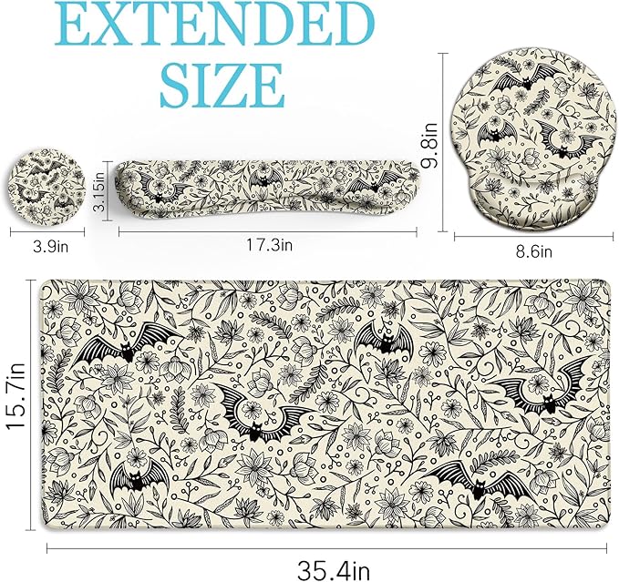 Goth Bat Mouse Pad Set Large Desk Mat for Desktop, Ergonomic Mouse Pad with Wrist Rest for Gaming, Keyboard Mat Wrist Support Cup Coaster Set, Gothic Office Desk Accessories Decor Supplies