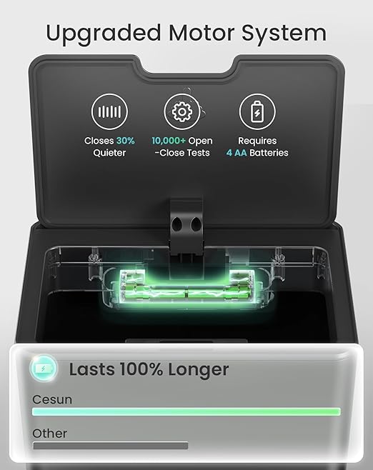 - 100% Longer Lifespan & Upgraded Smooth Closing: With an upgraded motor system, the lid of this automatic trash can glides shut like a whisper 10,000+ times.Light comes on when the lid is open. When your hand leaves the sensing area of the bathroom trash can with lid , the green light begins to flash for 5 seconds and automatically turns off