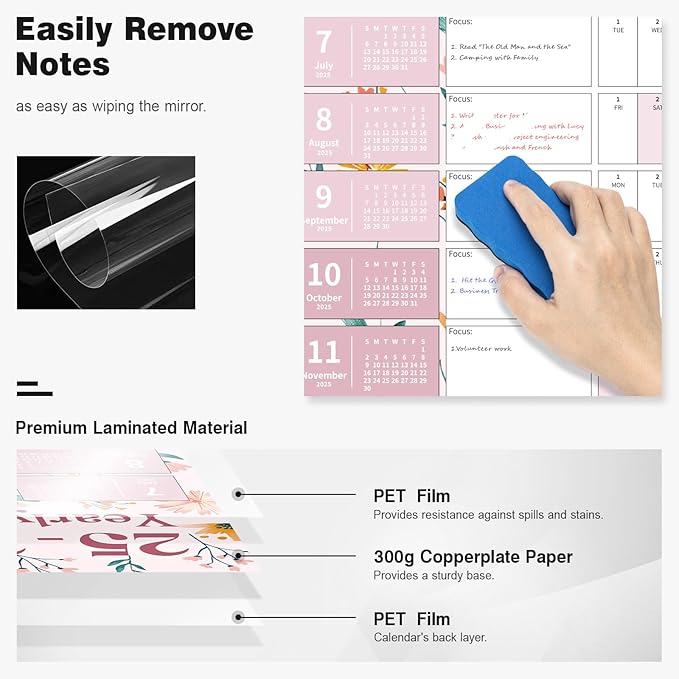 - ✨ Laminated Calendar with Dates: Waterproof wall calendar comes with a mini eraser, four dry-erase markers, 12 push pins, and 10 transparent round stickers. 12 months calendar covers the time range from July 2025 to June 2026, making it perfect for long-term use.