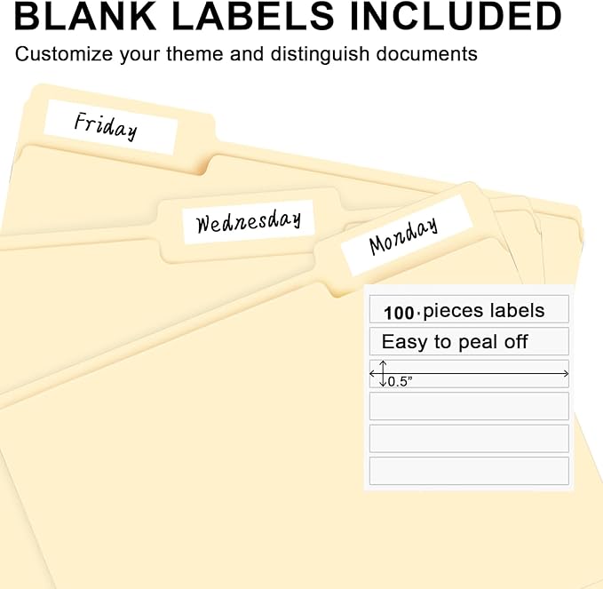 - PACKAGE INCLUDED: This bulk pack includes 100 letter size file folders (50 of each position) and 100 blank labels, idea for any home, office, or school project, providing you with plenty of storage space for all of your important documents
