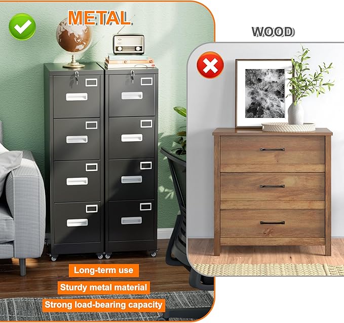 - 【Moveable on 4 wheels】Metal File Cabinet with wheels has 4 small lockable wheels, you can move them around as needed and the casters and wheels work great on all the different surfaces, besides the wheels can be locked and you can fix the cabinet where you want to place