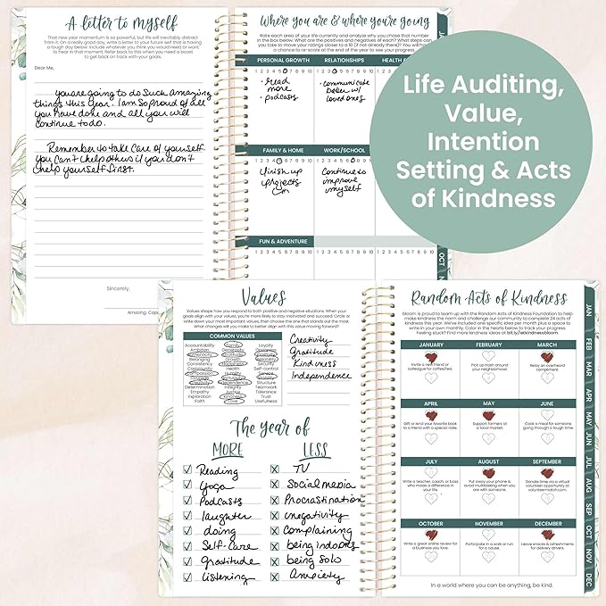 - BONUS: Packed with life coaching worksheets and inspirational features to help you set and achieve all of your goals for the year: yearly overview, values page, monthly bill tracking, joy & affirmations list, 9 notes pages, important dates for next year, monthly quotes & more!