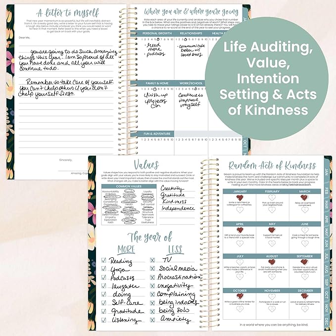 - BONUS: Packed with life coaching worksheets and inspirational features to help you set and achieve all of your goals for the year: yearly overview, values page, monthly bill tracking, joy & affirmations list, 9 notes pages, important dates for next year, monthly quotes & more!