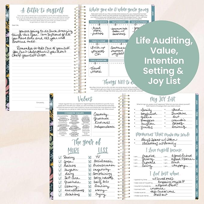 - BONUS CONTENT: Packed with life coaching worksheets and inspirational features to help you set and achieve all of your goals for the year: personal mission statement prompt and yearly goal setting page, weekly scheduling templates, values page, habit tracking, vision board, monthly spending log, 16 notes pages, motivational quotes, monthly challenges, and more!