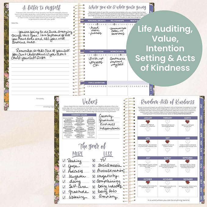 - Goal-Setting Tools & Bonus Features: More than a calendar planner, this also functions as a goal planner with goal-setting pages, monthly budget tracker, vision board prompts, affirmations, quotes, 9 note pages, and a yearly overview.