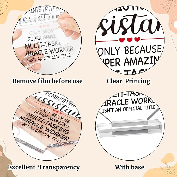 - MATERIAL: Our product is made of acrylic, crystal clear and unbreakable. It is a timeless reminder of the precious relationship between an executive assistant