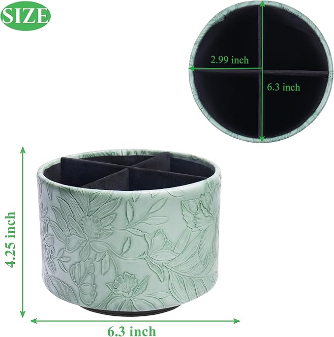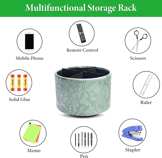 Hennaja Round Leather Art Supply Organizer,Remote Control Holder,360 Degree Spinning,Multi-Functional Pencil Holder,4 Compartments Desktop Stationary Organizer(1-Carved Dark Green)