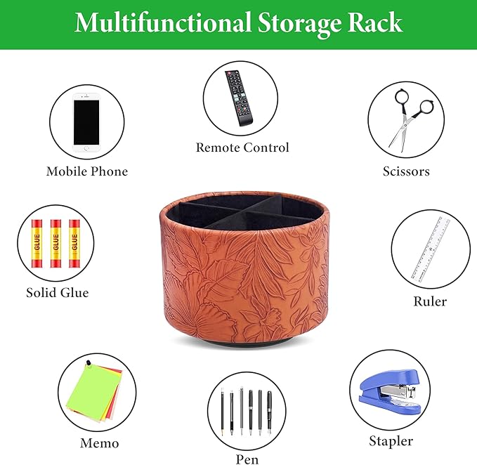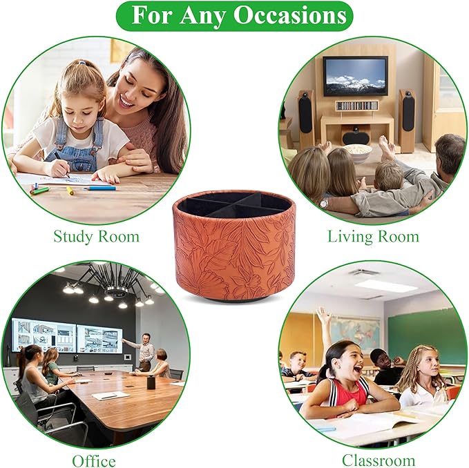 Hennaja Round Leather Art Supply Organizer,Remote Control Holder,360 Degree Spinning,Multi-Functional Pencil Holder,4 Compartments Desktop Stationary Organizer(1-Carved Brown)