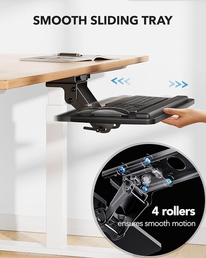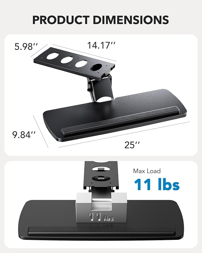 - Spacious & Compatible Size: 25” x 9.84” keyboard tray fits most keyboards and mice. Desk keyboard tray features a wrist rest to reduce wrist soreness, and prevent the keyboard from sliding off when the tray is tilted. This pull out keyboard tray under desk can hold up to 11 lbs, supports heavy mechanical keyboards and mouse