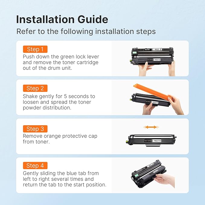- Warm Tips: After you installed the TN-227bk/c/m/y high yield brother toner cartridge replacement, your printer displays “No Toner” “Cannot Detect” “Cartridge Error” message, please restall the toner cartridges to make sure the chip of the toner cartridge is in good contact with the printer.