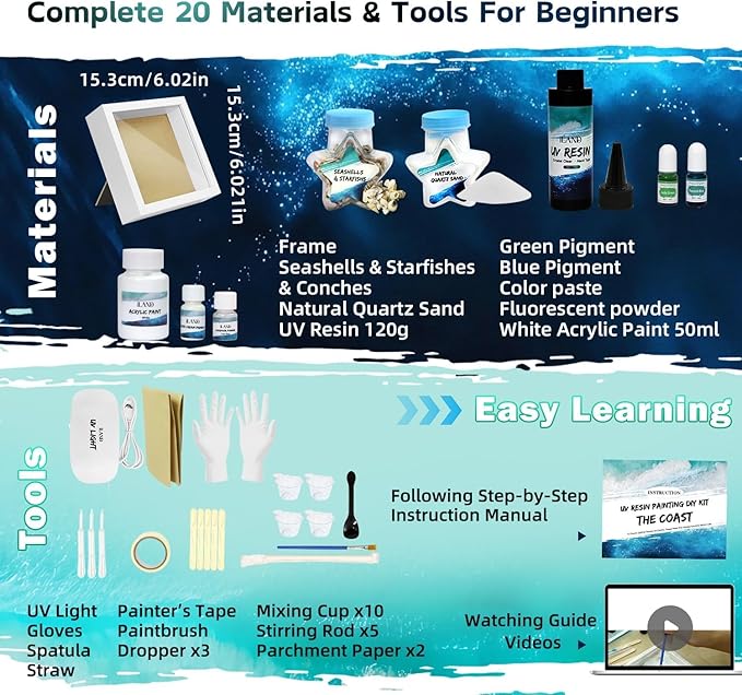 - 🛠️ All-Inclusive Craft Kits: With frame, UV resin kit with light, pigments, tools, sand, and seashells, follow our step-by-step guide to craft resin art like a pro— nice for beginners!