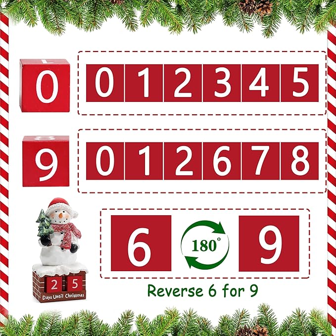 - Countdown Calendar to Christmas :This snowman decor includes an interactive countdown calendar with two number blocks , one prints with 0 1 2 6 7 8 (reverse 6 for 9), and another prints with 0 1 2 3 4 5. These 2 number blocks will enable a 30-day countdown to Christmas ,provides a fun way to countdown the days until Christmas, ensuring excitement builds in the lead-up to the big day.