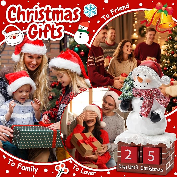 - Christmas snowman statues: Our Christmas Snowman Countdown Calendar Sculpture features a snowman wearing Santa hat and a red scarf, complete with a mini Christmas tree decorations, bringing warm holiday cheer to your home decor.The Christmas statues equipped with an engaging countdown feature, adding an interactive element to your Christmas decorations.In addition,coating with glitter on the surface.The glitter may shedding sightly during use,it is a normal characteristic and no detract from its beauty and functionary.