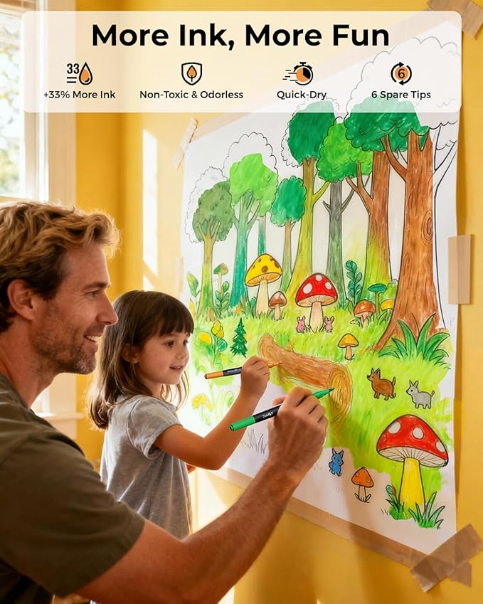 - More Ink, More Fun: Enjoy high-capacity 33% extra ink with non-toxic odorless formula, featuring instant-dry technology and 6 replaceable nibs for lasting use